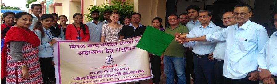 लाडनूँ 30 अगस्त 2018। केरल प्रांत के बाढ पीड़ितों की सहायतार्थ जैन विश्वभारती संस्थान (मान्य विश्वविद्यालय) आगे आया है। विश्वविद्यालय के समाज कार्य विभाग के तत्वावधान में इसके लिये जन समुदाय से आर्थिक सहयोग प्राप्त किया जा रहा है। उन्होंने सबसे पहले संस्थान के समस्त स्टाफ से बाढ सहायतार्थ चंदा एकत्र किया और गुरूवार को शहर में रैली निकाल कर आम जन से चंदा लिया। इसके लिये गुरूवार को संस्थान से एक रैली निकाली गई, जिसे शोध निदेशक प्रो. अनिल धर ने हरी झंडी दिखा कर रवाना किया। इस अवसर पर समाज कार्य विभाग के विभागाध्यक्ष डाॅ. बिजेन्द्र प्रधान, कार्यक्रम की संयोजक डाॅ. पुष्पा मिश्रा, शिक्षा विभाग के विभागाध्यक्ष प्रो. बीएल जैन, अहिंसा एवं शांति विभाग के विभागाध्यक्ष डाॅ. जुगल किशोर दाधीच, डाॅ. विकास शर्मा, अंकित शर्मा, रंजीत जायसवाल आदि उपस्थित थे। विभागाध्यक्ष डाॅ. बी. प्रधान ने बताया कि एकत्र की जाने वाली धन राशि को केरल के मुख्यमंत्री राहत कोष में भेजा जायेगा।