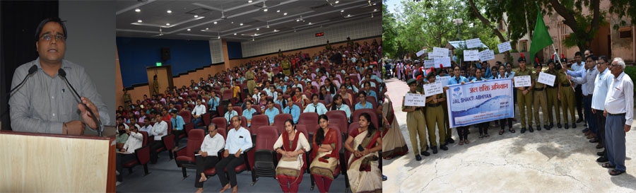 जल शक्ति अभियान के नोडल अधिकारी एवं पंचायत समिति के विकास अधिकारी हरफूल सिंह चैधरी ने कहा कि सरकार ने पानी बचाने का यह अभियान प्रारम्भ किया है। इसमें सबको मिलकर सहयोग करना है और जल संरक्षण के काम को आगे बढाना है। उन्होंने तालाबों, एनिकट आदि परम्परागत जलस्रोतों को बचाने और उनके संरक्षण के लिये सबको प्रेरित किया। साथ ही कहा कि वृक्षारोपण अधिक से अधिक करना आवश्यक है। पेड़ों के कारण हरियाली रहती है और हरियाली के कारण बारिश ज्यादा होती है। उन्होंने कम पानी से ज्यादा खेती की तकनीक को विकसित करने की जरूरत बताई तथा कहा कि इस्रायल की तर्ज पर खेती करके जल बचाया जा सकता है। कार्यक्रम के प्रारम्भ में कुलसचिव रमेश कुमार मेहता ने स्वागत वक्तव्य प्रस्तुत करते हुये इस बात पर हर्ष जताया कि भारत सरकार के इस अभियान में लिये नागौर जिले में लाडनूं को चुना और लाडनूं में जैन विश्वभारती विश्वविद्यालय का चयन किया गया। कार्यक्रम में विशिष्ट अतिथि के रूप में भूजल विभाग के अधिशाषी अभियंता प्रवीण, नरेगा के सहायक अभियंता दिनेश कुमार मंचस्थ थे। कार्यक्रम के अंत में शिक्षा विभाग के विभागाध्यक्ष प्रो. बीएल जैन ने आभार ज्ञापित किया। कार्यक्रम में विभिन्न राजकीय अधिकारी, विश्वविद्यालय के अधिकारी एवं विद्यार्थी उपस्थित थे। कार्यक्रम का संचालन शोध निदेशक डा. जुगलकिशोर दाधीच ने किया।