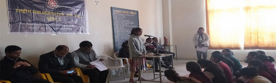 30 जनवरी 2020। जैन विश्वभारती संस्थान (मान्य विश्वविद्यालय) के अन्तर्गत राष्ट्रीय सेवा योजना की दोनों ईकाइयों के संयुक्त तत्वावधान में चल रहे स्वच्छता पखवाड़े के साथ गुरूवार को घूंघट छोड़ो अभियान एवं शहीद दिवस भी मनाया गया। कार्यक्रम की अध्यक्षता करते हुये आचार्य कालू कन्या महाविद्यालय के प्राचार्य प्रो. आनन्द प्रकाश त्रिपाठी ने घूंघट प्रथा के अवगुणों के बारे में बताया तथा सभी स्वयंसेवी छात्राओं को सामुहिक रूप से घूंघट के त्याग की शपथ दिलवाई। इस अवसर पर छात्राओं स्नेहा पारीक, मानसी जांगिड़, आयशा सिंह आदि ने भी अपने विचार व्यक्त किये। पूजा जैतमाल ने एक गीत की प्रस्तुति दी। एनएसएस प्रभारी डाॅ. प्रगति भटनागर ने स्वच्छता पखवाड़े के अन्तर्गत चल रहे कार्यक्रमों की जानकारी देते हुये घूधट प्रथा को अनुपयोगी बताया और कहा कि वर्तमान युग में घूंघट रखना नितात अनुचित है। उन्होंने महात्मा गांधी की पुण्य तिथि शहीद दिवस पर उन्हें याद करते हुये दो मिनट का मोन रखवा कर उन्हें श्रद्धांजलि अर्पित की। कार्यक्रम का संचालन सुरभि नाहटा ने किया।